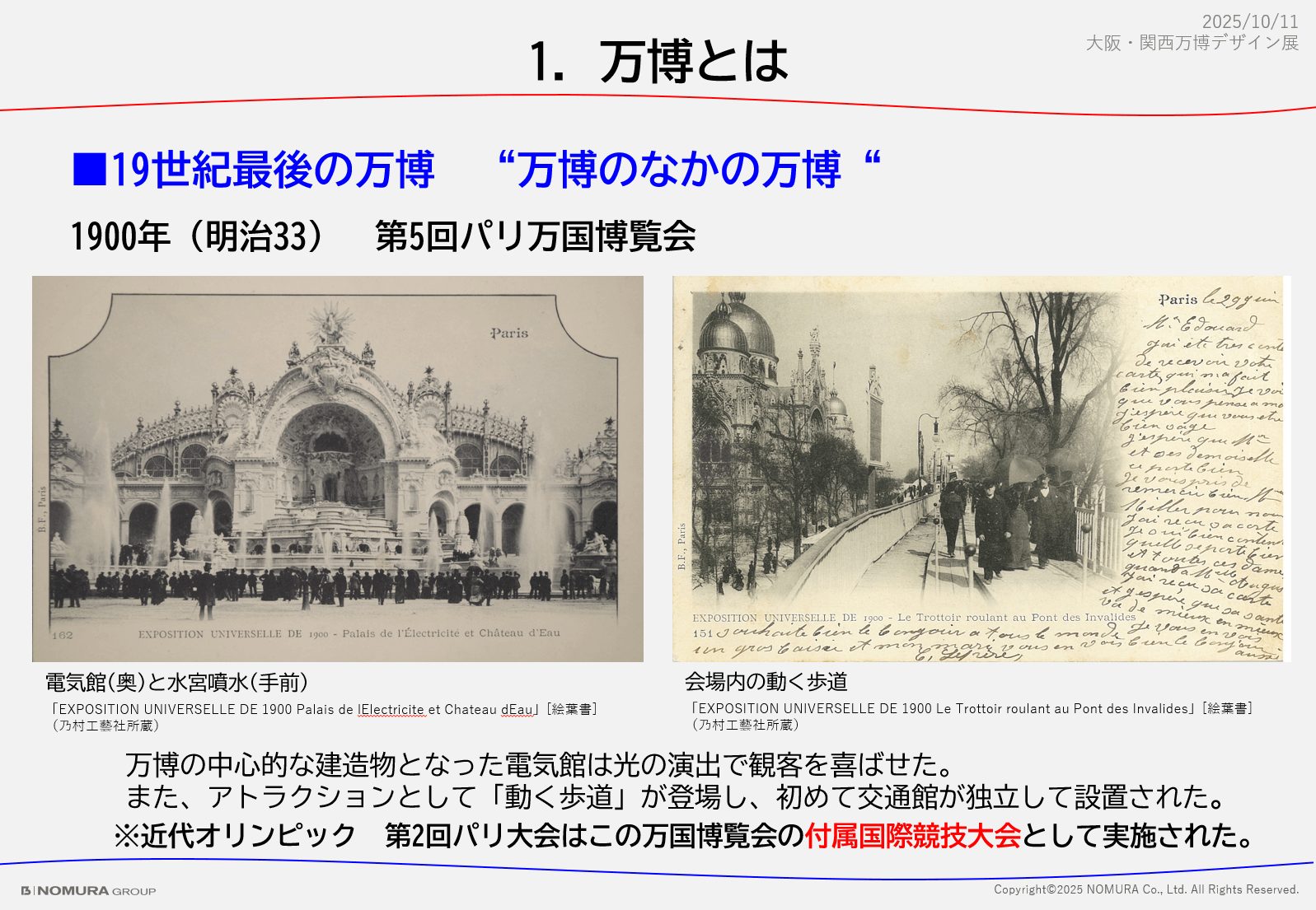 最初の万博は1851年ロンドンで開催されました。産業革命に成功した大英帝国がそれを世界に示す意図と、植民地をロンドンに集めて俯瞰するという隠された意図もあり、当時は国別単独パビリオンではなくクリスタルパレスという集合パビリオンに各国からの展示品が集約されました。ポータブルの蒸気機関の展示や、輪転印刷の実演が行われ、印刷がここから世の中に広まっていくことになります。1900年に開催されたパリ万博は「万博の中の万博」と呼ばれ、会場内に「動く歩道」が設置されました。展示も世紀末を象徴し、馬車と自動車が並んでいました。このパリ万博の併催行事が第2回近代オリンピックで、万博の褒賞制度がオリンピックのメダル授与に繋がっていきます。金銀銅メダルは万博が先だったのです。統一テーマが初めて設定されたのは1933年シカゴ万博で、テーマは「進歩の一世紀」でした。このテーマが、1970年大阪の「人類の進歩と調和」、今回の「いのち輝く未来社会のデザイン」へと続く流れです。
