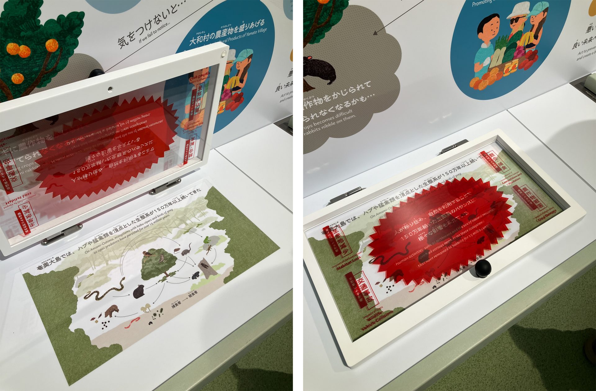 奄美大島における本来の生態系サイクル図と、人の登場でバランスが崩れた生態系サイクル図の展示