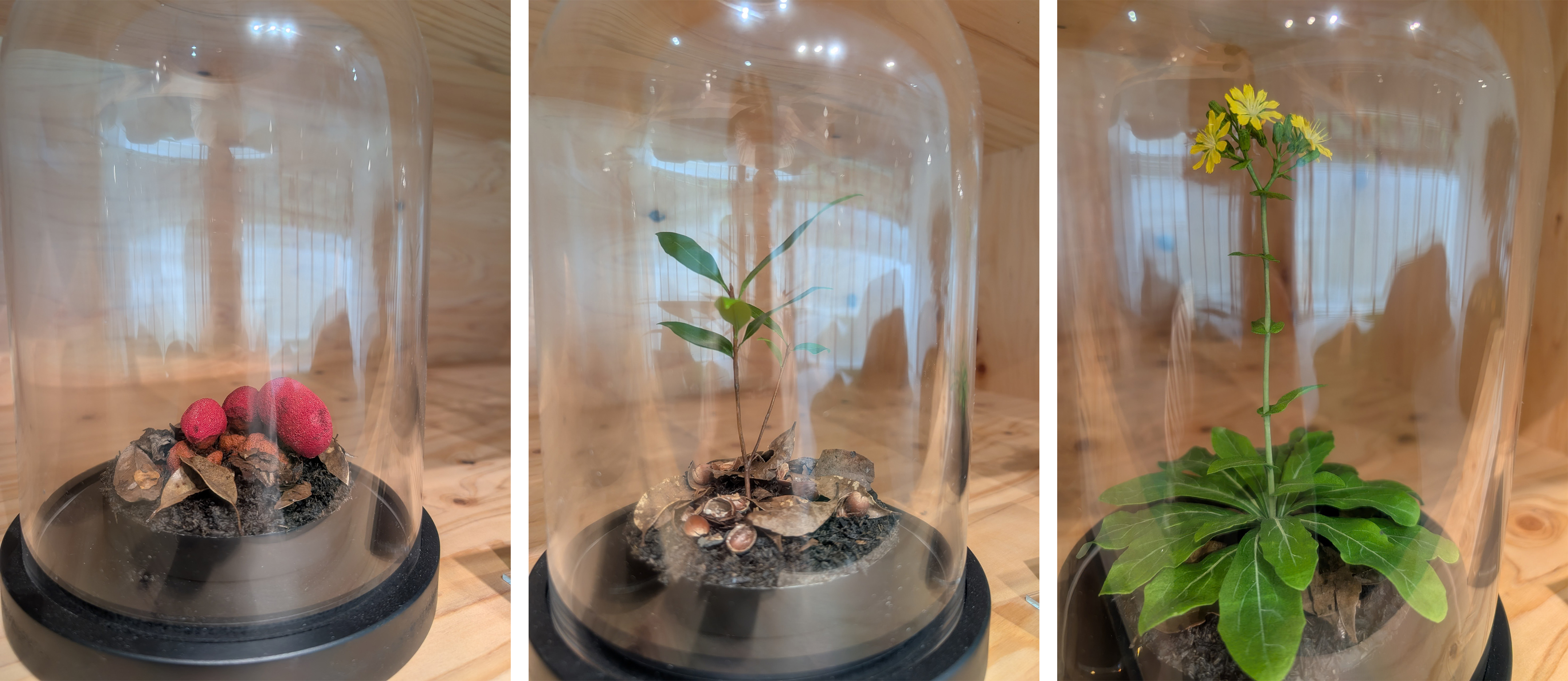 クロウサギが好む植物の造形展示(左からヤクシマツチトリモチ、スダジイのドングリ、ホソバワダン)