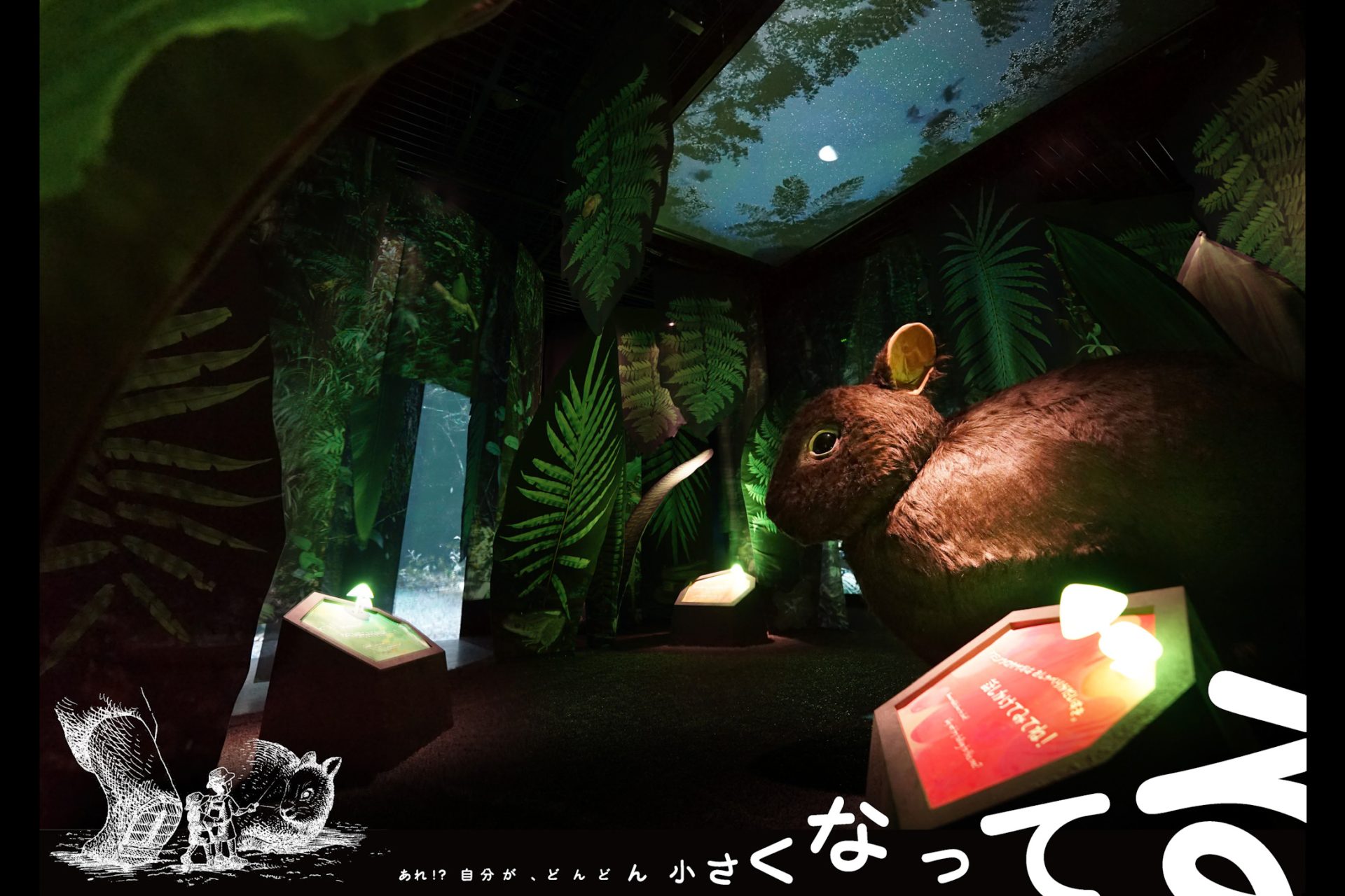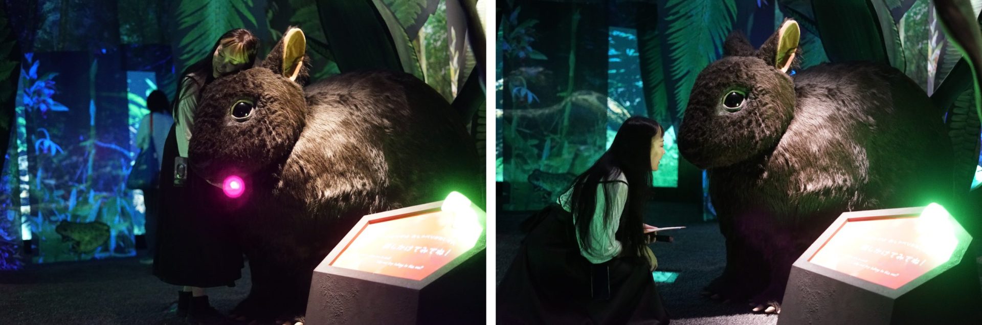 「くるぐるの森」では、クロウサギ視点での夜の森を体験する。そのため、ここで出会う生き物たちは実際のおおよそ4倍サイズで来場者を出迎える