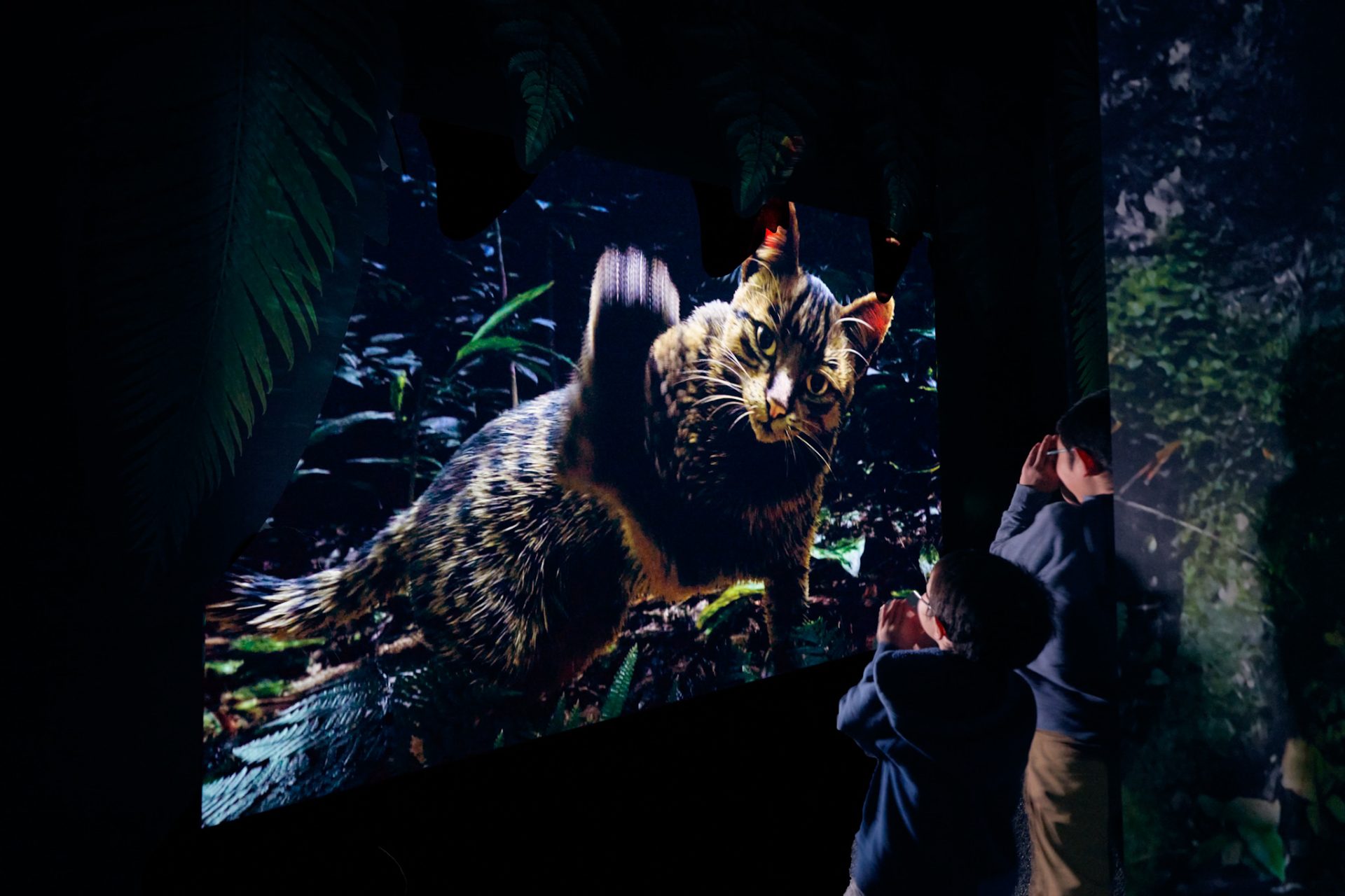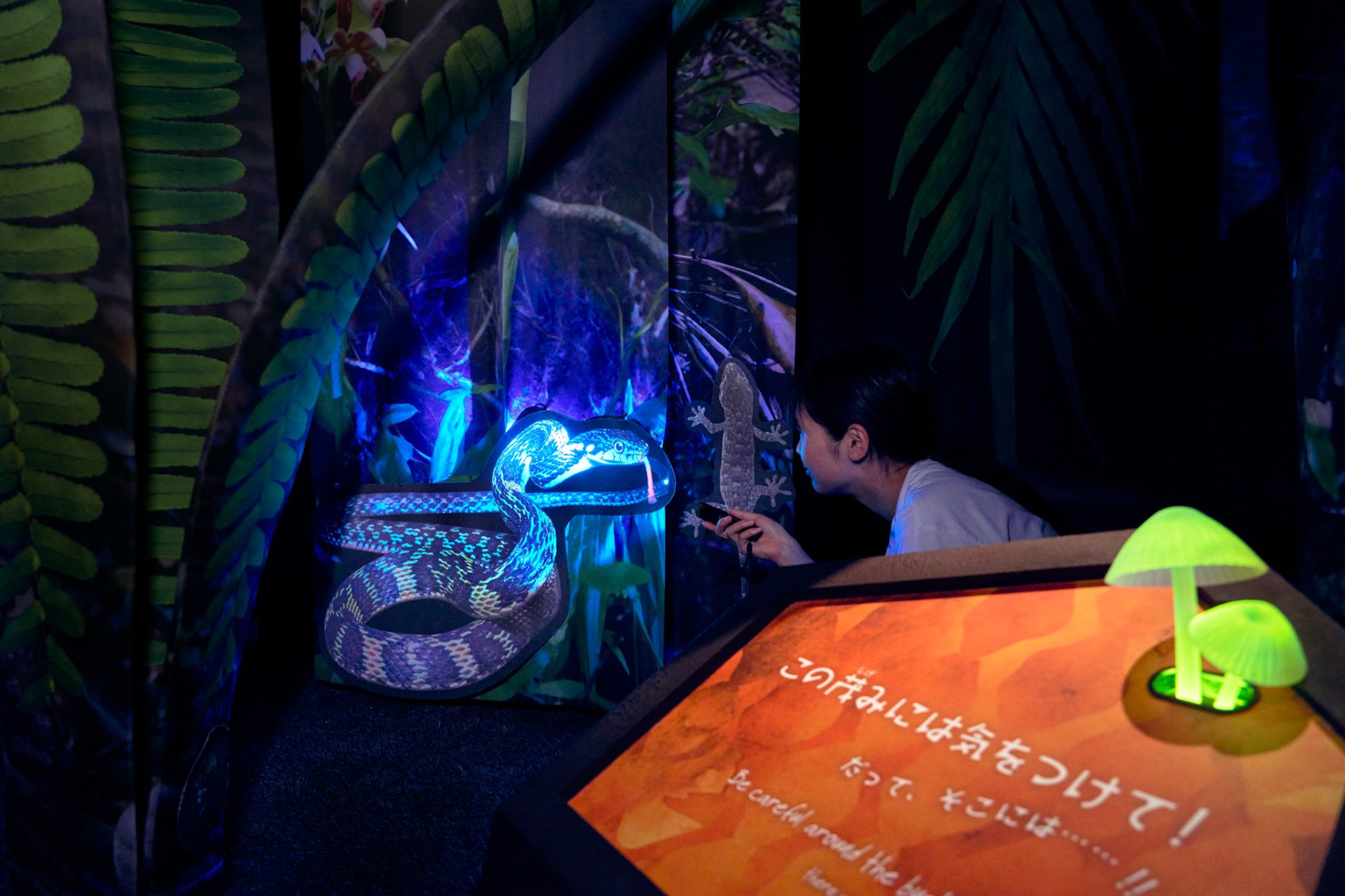 奄美の夜の森を再現した「くるぐるの森」。特殊なライトを懐中電灯代わりに使い、夜の森の生き物を探し出す、ハラハラドキドキの冒険が楽しめる