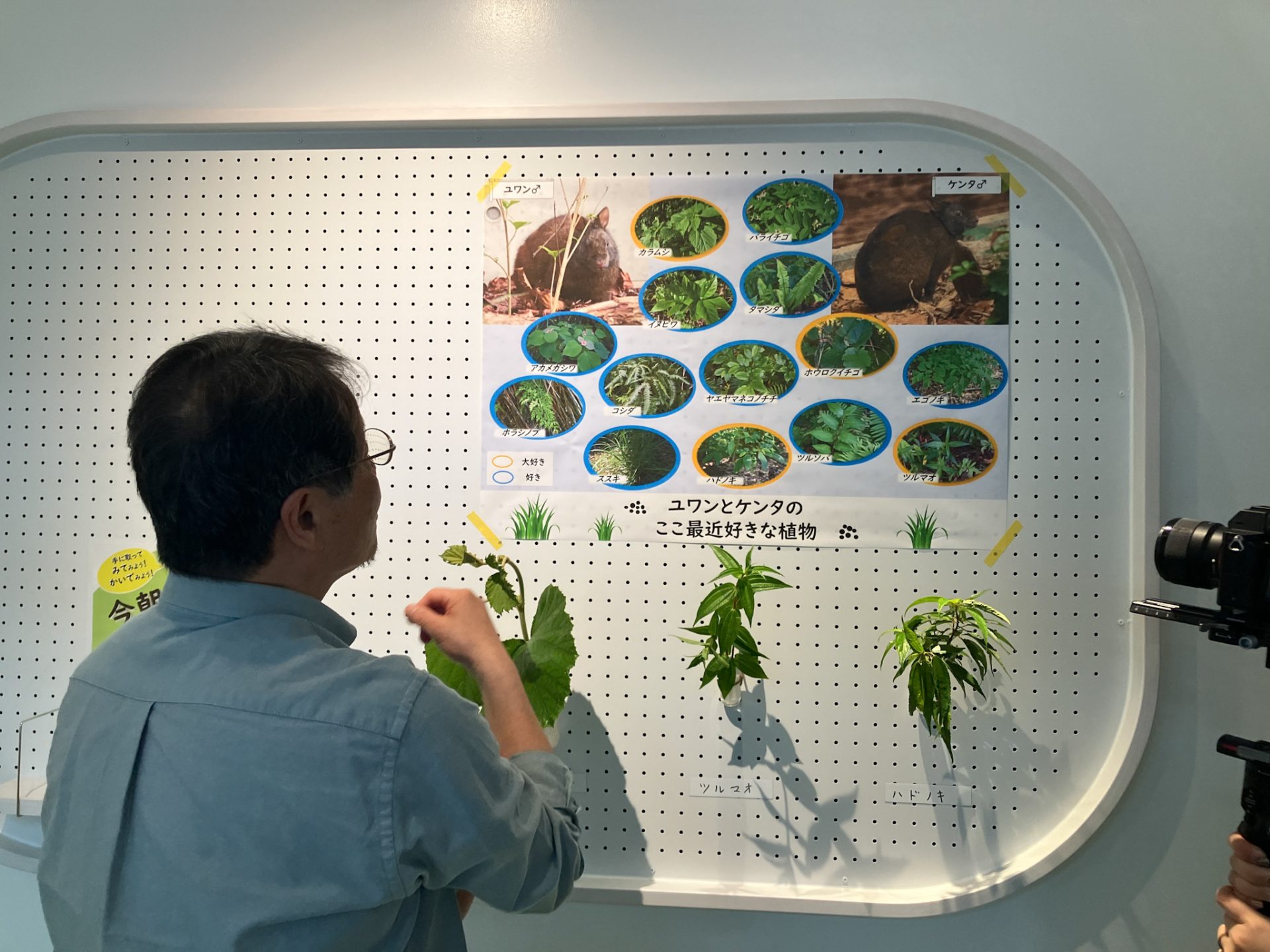 展示されている草木は、毎日スタッフが山から採集し、その日にクロウサギが実際に食べている一部を用いたリアルで新鮮な展示となっている